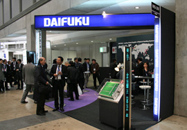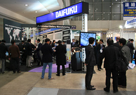 - 実機展示した充放電装置のコンタクトユニットや、EV用ラミネートセルのマガジンが目を引き、多くの来場者でダイフクブースは大盛況でした。