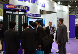 また、エージング工程用ストッカーの地震対策に、新開発の【減振ラック】実機モデルを紹介。高効率保管が求められるエージングラックは、高層化がトレンドで電池の落下対策が必須となっており、少ない投資で大きな効果が期待できる減振ラックが来場者の目を引きました。