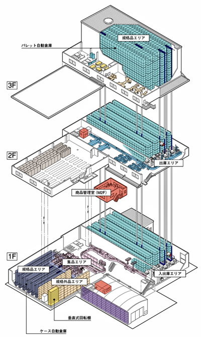 多量品を処理するRB(RM4基、格納数4,400パレット)。1階部分の電光表示板も更新した。