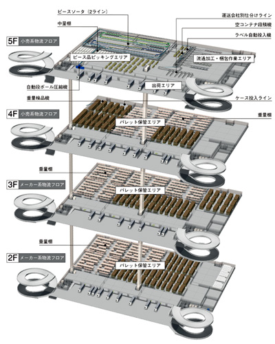 市川ロジスティクスセンターは5階建ての大型マルチテナント型施設「プロロジスパーク市川Ⅱ」内の2~5階に入居、専有面積は約9万㎡の規模です。タカラトミーのメーカーとしての商品供給を担う“メーカー系物流”とGMS(総合量販店)などの小売向けに他社製品も一括して扱う“小売系物流”の2つの機能を有しています。2~3階は「メーカー系物流フロア」、4~5階は「小売系物流フロア」として区分けしており、国内向けの保管・配送業務を一手に担っています。